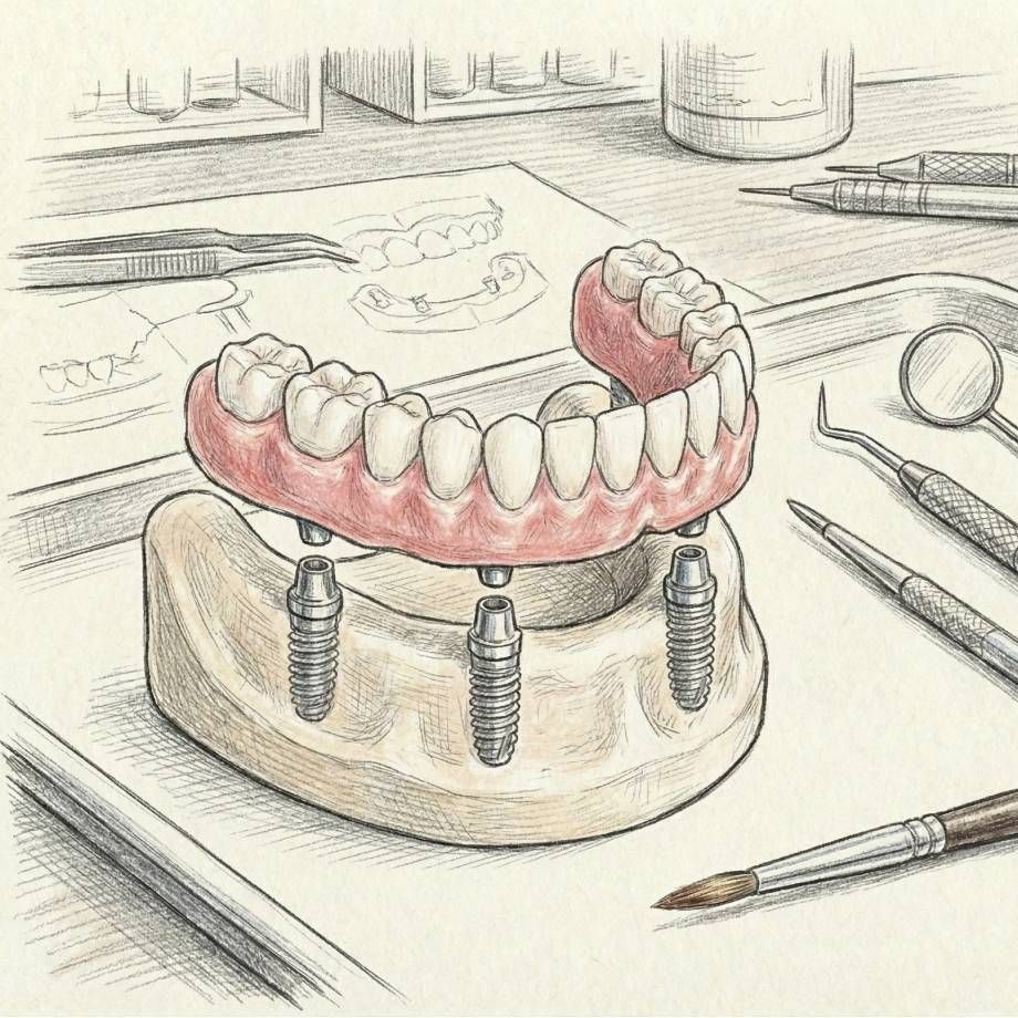 Das Beste, was die moderne Medizin Menschen mit Zahnlosigkeit heute bieten kann Bei Dental Family wissen wir, wie wichtig hochwertiger Zahnersatz für Gesundheit, Wohlbefinden und den Alltag ist. Mit besonderer Sorgfalt betreuen wir ältere Patientinnen und Patienten, für die Stabilität, Komfort und Sicherheit der Behandlung von zentraler Bedeutung sind. Wir wissen, wie unangenehm und belastend herausnehmbare Prothesen sein können. Verrutschen, Herausfallen, Reizungen des Zahnfleisches, Schmerzen, eingeschränktes Geschmacksempfinden, Probleme beim Sprechen sowie die Notwendigkeit, Prothesenkleber zu verwenden, der nicht gesundheitlich neutral ist – all dies sind Schwierigkeiten, mit denen viele Betroffene täglich konfrontiert sind. Die moderne implantologische Versorgung auf Basis von vier Implantaten stellt eine sichere und effektive Alternative zu klassischen Prothesen dar. Dabei werden 4 Zahnimplantate eingesetzt, auf denen ein festsitzender Zahnersatz – eine Hybridprothese oder eine Brücke – verankert wird. Diese Lösung bietet: • maximale Stabilität – kein Verrutschen oder Herausfallen • keine Reizung des Zahnfleisches • natürliches Geschmacksempfinden • hohen Komfort beim Essen, Sprechen und Lächeln • keine Notwendigkeit von Prothesenklebern Ein entscheidender Faktor für den Behandlungserfolg ist eine sehr präzise Diagnostik. In unserer Praxis steht die moderne DVT-Diagnostik (digitale Volumentomographie) zur Verfügung, die eine exakte Beurteilung der Knochensituation ermöglicht. So können die besten und sichersten Positionen für die Implantate bestimmt und Komplikationen effektiv vermieden werden. Die implantologischen Eingriffe werden von einem sehr erfahrenen Chirurgen durchgeführt. Dank moderner Behandlungstechniken ist es in vielen Fällen möglich, dem Patienten bereits kurze Zeit nach dem Eingriff einen festsitzenden provisorischen Zahnersatz einzusetzen. Nach Abschluss der Einheilphase der Implantate bieten wir: • Hybridprothesen – stabil, funktionell und langlebig, • festsitzende Brücken – für Patientinnen und Patienten mit höchsten ästhetischen und funktionellen Ansprüchen. Die Versorgung mit vier Implantaten ist eine schnelle, umfassende und verlässliche Behandlungsmethode, die die Lebensqualität zahnloser Patientinnen und Patienten deutlich verbessert. Sie steigert den täglichen Komfort, die Ästhetik des Lächelns, die Kaufunktion und – vor allem – trägt wesentlich zur allgemeinen Gesundheit bei. Wir freuen uns, dass immer mehr Patientinnen und Patienten die Möglichkeiten der modernen Zahnmedizin erkennen und sich bewusst für diese Behandlung entscheiden – als Investition in ihre Gesundheit und Lebensqualität. Dabei ist wichtig zu betonen, dass das Alter keine entscheidende Rolle spielt – ausschlaggebend sind die individuellen medizinischen Voraussetzungen und eine sorgfältige Behandlungsplanung.